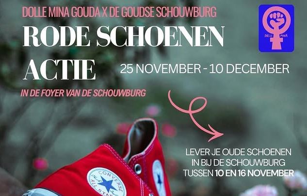 Tussen 25 november en 10 december zullen de Dolle Mina's in de foyer van de Goudse Schouwburg tientallen rode schoenen tentoonstellen. De schoenen staan symbool voor slachtoffers van femicide, achter elke schoen gaat een verhaal schuil van een vrouw die vermoord is vanwege haar gender. Iedereen kan een steentje bijdragen door oude/niet meer gebruikte schoenen in te leveren; tot 16 november in de container voor de ingang van de schouwburg. Ze hoeven niet rood te zijn en je krijgt ze niet terug!